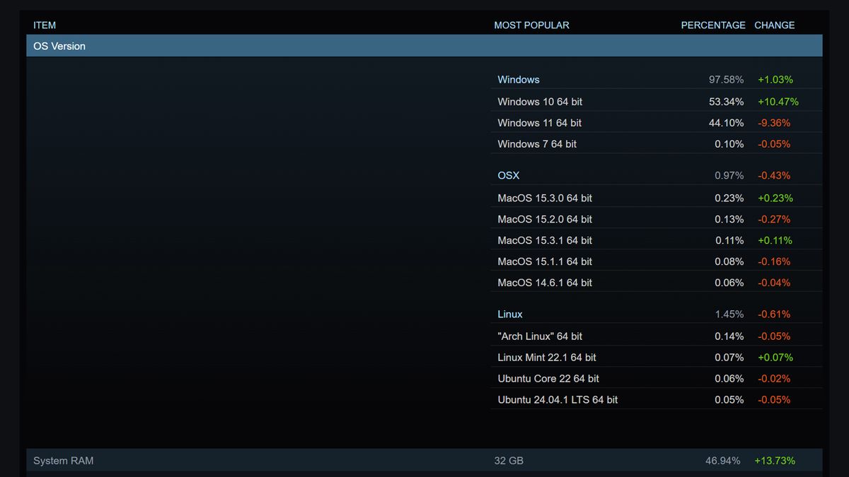 Provavelmente devido ao afluxo repentino de usuários chineses, também vemos algumas gotas enormes em outras tendências de hardware. Por um lado, o Windows 10 ganhou um grande salto de 10,47% no número de usuários, apesar do Windows 11 se tornar lentamente mais popular no resto do mundo, pois o primeiro está chegando à data de final de vida. Outra grande mudança que notamos é o aumento maciço dos sistemas com 32 GB de RAM, com 46,94% dos usuários que embalam memória maior. No mês passado, 45,07% dos sistemas pesquisados ​​tiveram apenas 16 GB de RAM; portanto, essa mudança provavelmente também é provocada pelo afluxo repentino de novos sistemas da China (a menos que milhões de pessoas tivessem o desejo repentino de atualizar o RAM em seus sistemas).
