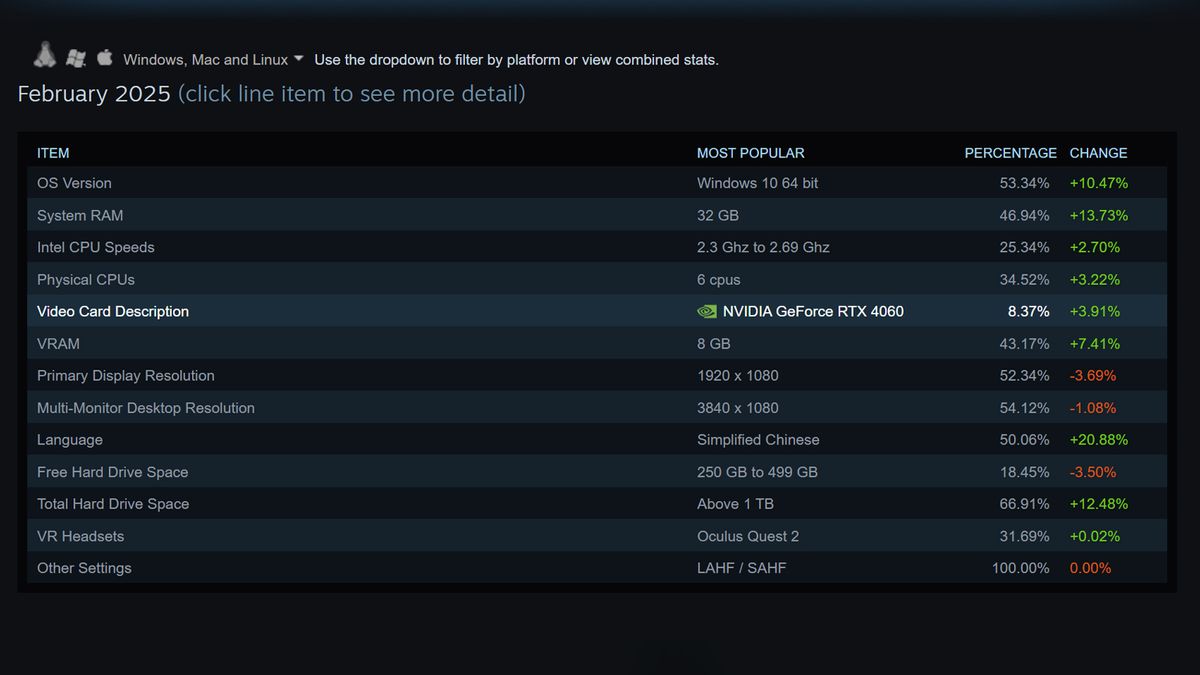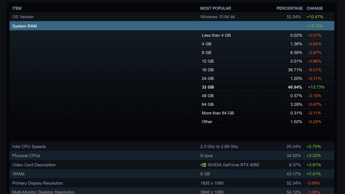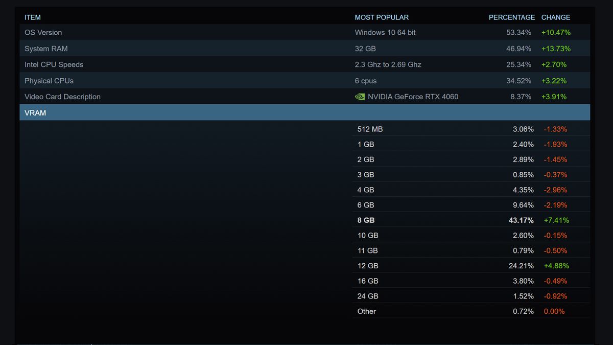 Se essas mudanças maciças foram provocadas pelos usuários da China, parece que os jogadores desse país levam bastante a sério seu hardware. A popularidade de 32 GB de RAM, 8 a 12 GB de VRAM e resolução de 1440p sugere que este é o ponto ideal para a maioria dos jogadores quando se trata de suas especificações de PC.