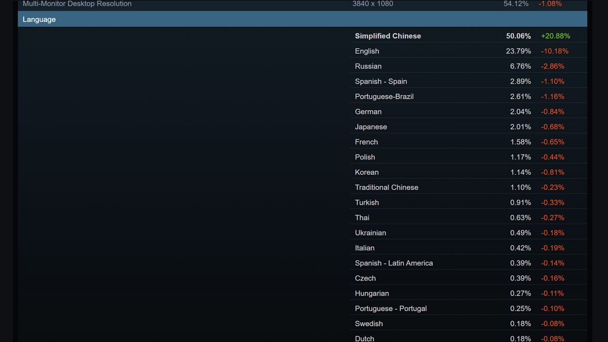 A pesquisa mais recente mostrou um aumento massivo de 20,88% nos usuários de língua chinesa, com o idioma reivindicando o primeiro lugar e colocando o inglês em segundo lugar em 23,79%. Isso significa que 50,06% dos usuários do Steam pesquisados ​​preferem o chinês como o idioma no Steam, o que é um desenvolvimento surpreendente. Não porque o chinês se tornou o idioma principal da plataforma de jogos, mas porque aconteceu de repente.