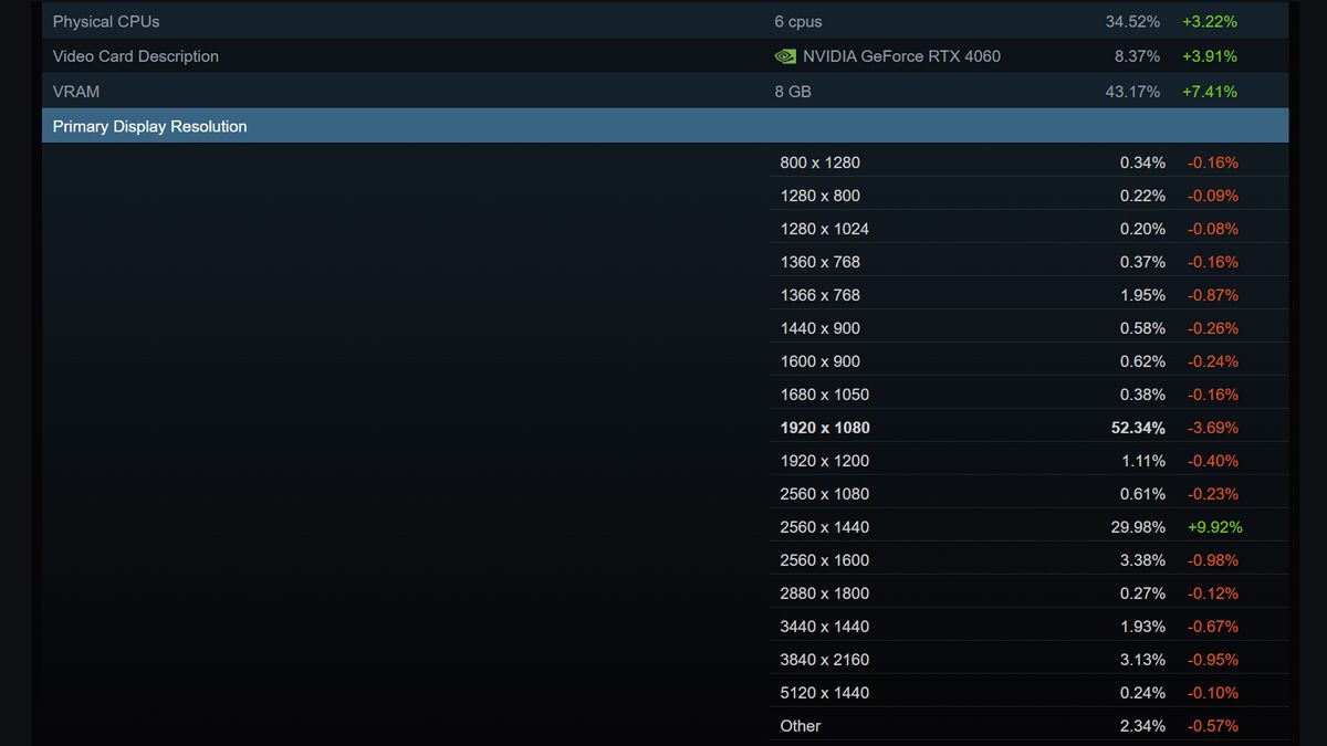 Além disso, também vimos uma grande mudança nas resoluções de exibição primária, com exibições de 1440p recebendo um aumento de 9,92%, com 29,98% dos usuários pesquisados ​​ostentando essa resolução. As telas Full HD de 1080p ainda são as mais populares, com 52,34%, mas parece que mais jogadores estão gravitando em direção a resoluções mais altas. Isso provavelmente é impulsionado pelo aumento da popularidade das GPUs com 8 GB e 12 GB de VRAM, com o aumento de 7,41% e 4,88%, respectivamente.