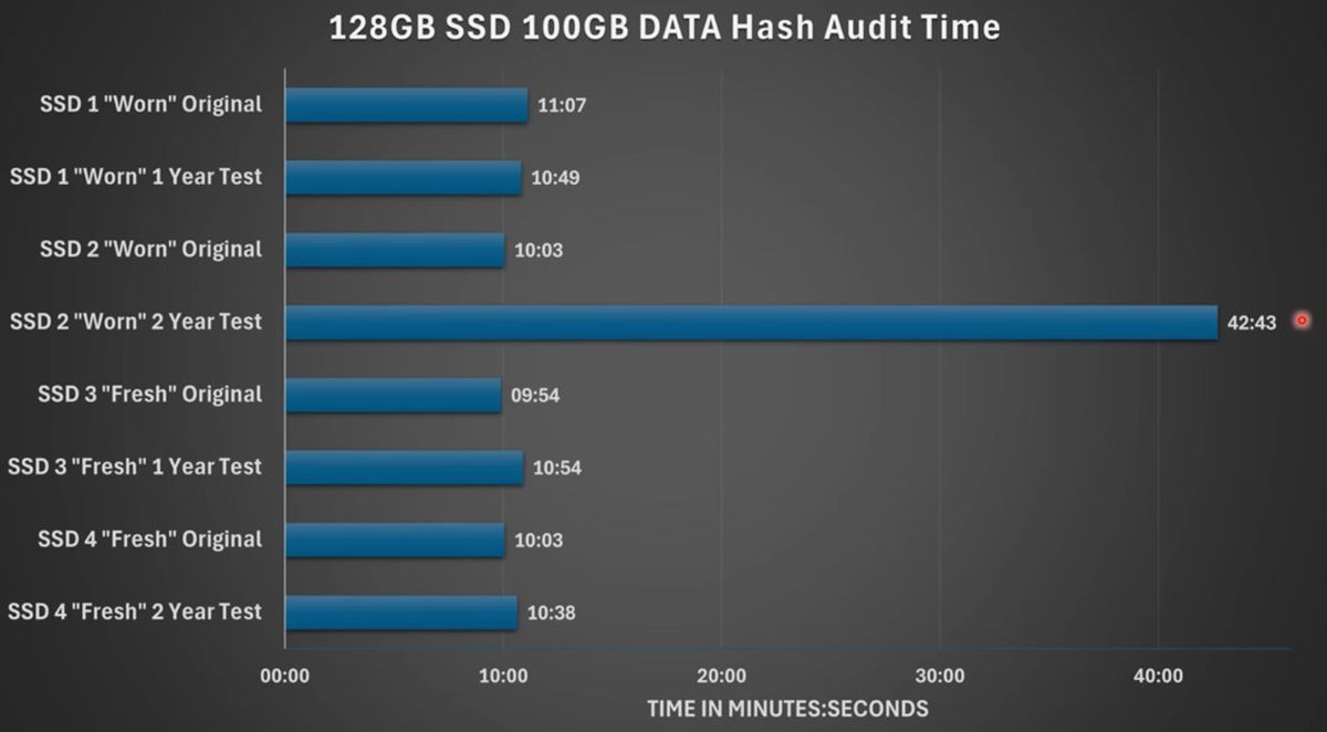 Como os dados do SSD gastos estavam sendo verificados, já havia sinais de degradação do desempenho. A auditoria de hash acabou revelando que quatro arquivos foram corrompidos (hash não correspondentes). Olhando para o horário decorrido, observa -se que essa operação levou mais 4x a mais de 10 minutos e 3 segundos a 42 minutos e 43 segundos.