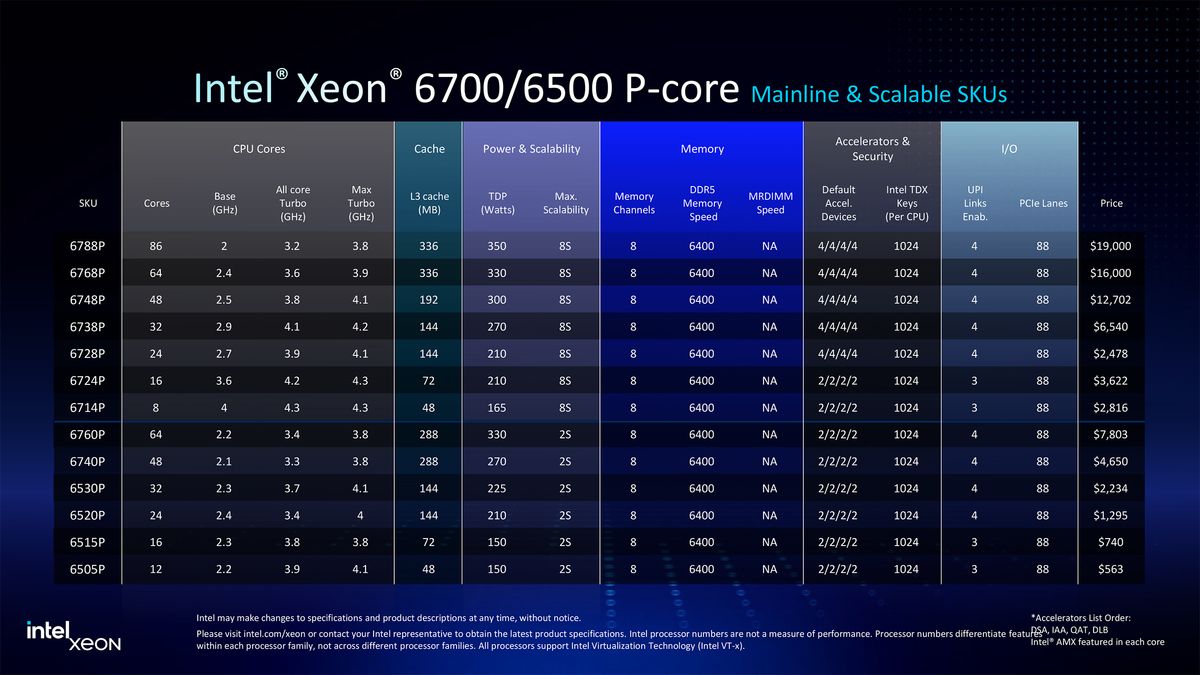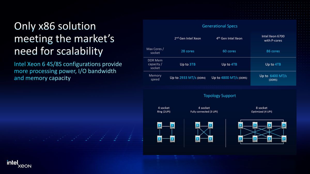 Os processadores Xeon 6500 e Xeon 6700 da Intel apresentam até 86 núcleos. Eles visam as máquinas 1p, 2p, 4p e 8p, servindo assim uma ampla gama de aplicações, a partir de máquinas de processador de nível básico para máquinas de 8 vias de nível corporativo que são usadas para executar cargas de trabalho críticas e críticas de missão.