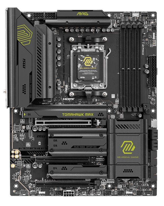 O Wifi Tomahawk Max fica em um PCB preto de 8 camadas de servidor, com grandes isolantes de calor, cobrindo os isolantes de calor VRM e do estilo de placa encarregados de resfriar os soquetes e chipset M.2. Quebrar a aparência totalmente preta, há destaques verde-amarelo brilhante com o símbolo MAG e a marca Tomahawk/Arsenal Gaming no restante dos dissipadores de calor. Os amantes do RGB devem adicionar seus próprios cabeçalhos, pois nenhum está embutido. No geral, é uma placa-mãe de boa aparência que deve se misturar com a maioria dos temas de construção.