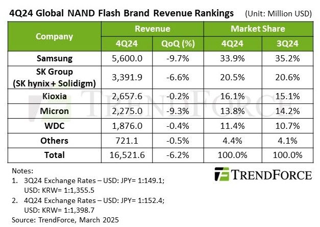 Trendforce cita enfraquecendo a demanda do consumidor como a força motriz por trás dessa desaceleração. Até o final de 2024, os fabricantes de PC e smartphones estão sendo pressionados para limpar o excesso de inventário, diminuindo os preços do Flash NAND como um efeito de imitação. ASPS (preços médios de venda) para o NAND Flash caiu 4% de QOQ com um declínio de 2% nas remessas gerais. Espera-se que essa tendência persista no primeiro trimestre fiscal deste ano, com a Trendforce projetando uma enorme queda de 20% na receita.