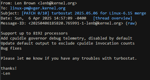 O Turbostat tinha um limite codificado (CPU_SUBSET_MAXCPUS) que foi definido como 1.024, que define o número máximo de CPUs (núcleos) que ele pode lidar. Ontem, pouco antes da janela de mesclagem para o Linux 6.15-RC1, o limite da CPU foi aumentado para 8.192, juntamente com a adição de uma ferramenta de telemetria de depuração ociosa da CPU e várias correções de bugs.