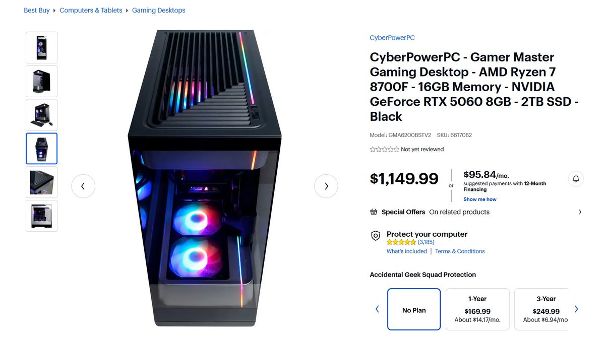 O sistema pré-construído em questão é um desktop “Gamer Master” CyberPowerpc, vendido pela Best Buy. Ele possui um processador Ryzen 7 8700F, 16 GB de memória DDR5, SSD de 2 TB e, é claro, uma placa gráfica RTX 5060 8GB. Supondo que as imagens representem o modelo real, o RTX 5060 interno parece ser um modelo compacto de parceiro AIB de slot duplo (não um cartão de edição de fundadores) com um único cabo de alimentação de 8 pinos.