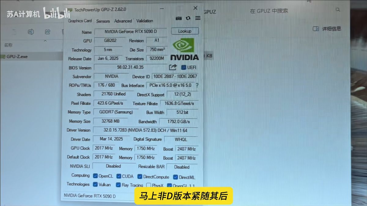 O vídeo compartilhado por Computador su-a Em Bilibili, também mostrou a leitura GPU-Z do cartão, provando que ele usa o mesmo chip GB202 com 32 GB de VRAM GDDR7. Também está equipado com o PCIE 5.0 X16, garantindo as taxas de transferência mais rápidas possíveis.