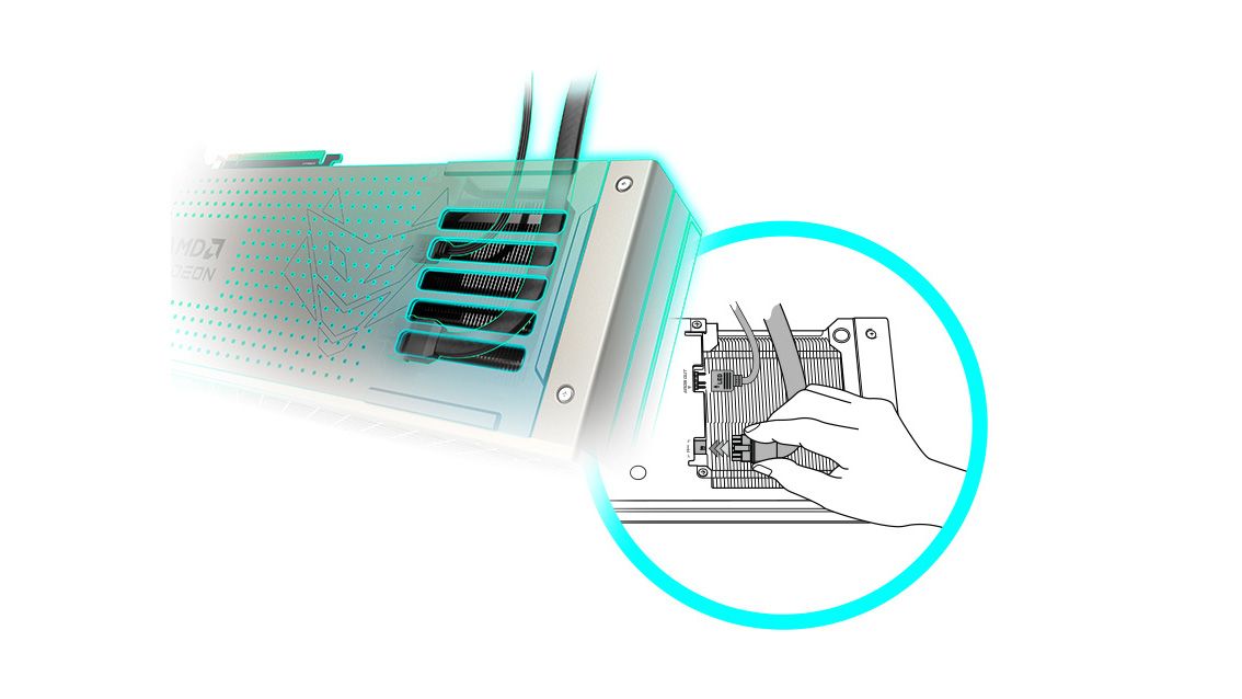 O Sapphire Nitro+ RX 9070 XT o conector suplementar está localizado dentro a própria placa gráfica. O conector está oculto sob uma placa traseira removível que é magneticamente presa em vez de aparafusar. Ao remover a placa traseira, os usuários encontrarão o conector de 16 pinos localizado na borda direita do PCB, ao lado de um grande corte acima do ventilador direito responsável por “segurar” o cabo que se conecta ao conector. Os cabos de energia são roteados sob a placa gráfica.