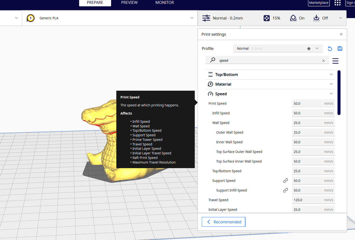 Além disso, às vezes a impressão 3D em alta velocidade resulta em vibrações e tensão mecânica nos componentes da impressora 3D, como os cintos, o que também pode resultar em defeitos. Imprimir a uma velocidade mais baixa impede que isso aconteça. Você pode ajustar a velocidade no Slicer 3D. Lembre -se de que, embora as velocidades mais lentas ajudem a melhorar a qualidade da superfície da sua impressão, elas também aumentam o tempo de impressão e, em alguns casos, podem resultar em outros problemas. À medida que você reduz a velocidade, verifique se você não o reduz muito para que resulte em outros defeitos de impressão 3D. A velocidade de impressão 3D padrão e ideal na maioria dos fatores de corte 3D é geralmente 50 mm/s. Se o seu estiver acima disso, você deve reduzi -lo.