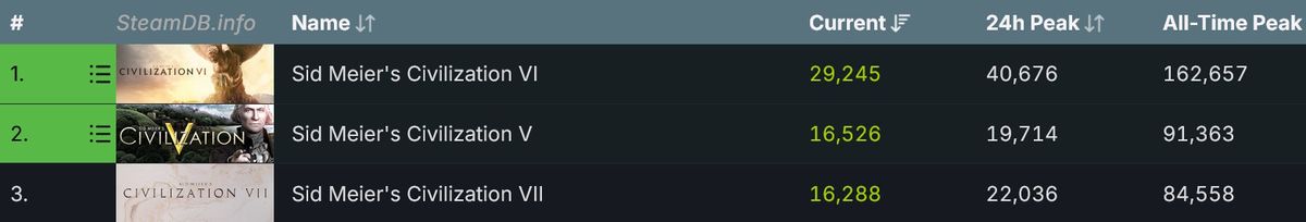 As contagens simultâneas de jogadores também continuam ficando bem atrás das da civilização 6. Nesse momento, de fato, a contagem simultânea de jogadores do Civ 7 está até atrasada para trás da civilização 5, que foi lançada há 15 anos.