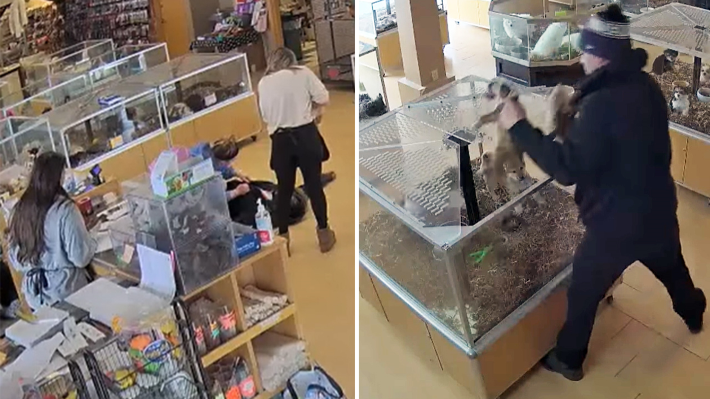 Imagens do assalto começa com um homem caindo para trás enquanto olha para uma caixa de animais. Uma mulher que parece ser mãe com seus dois filhos pequenos e um funcionário da loja depois caminha para cuidar dele.
